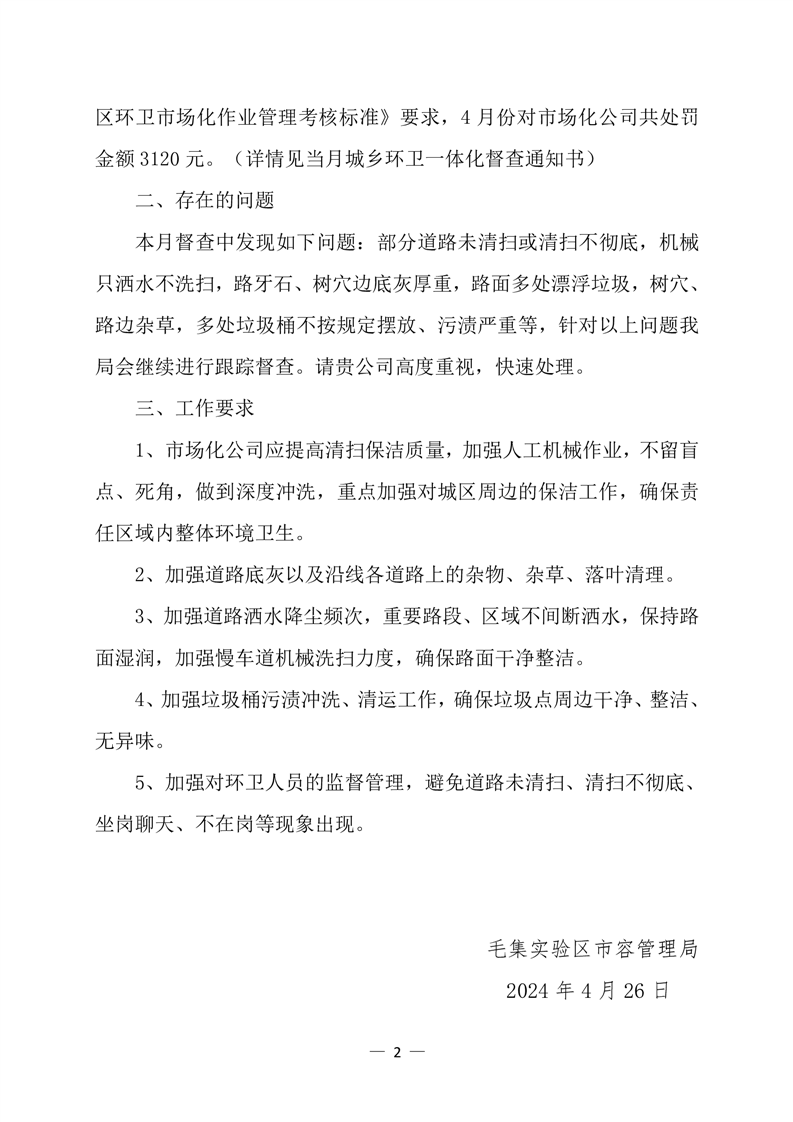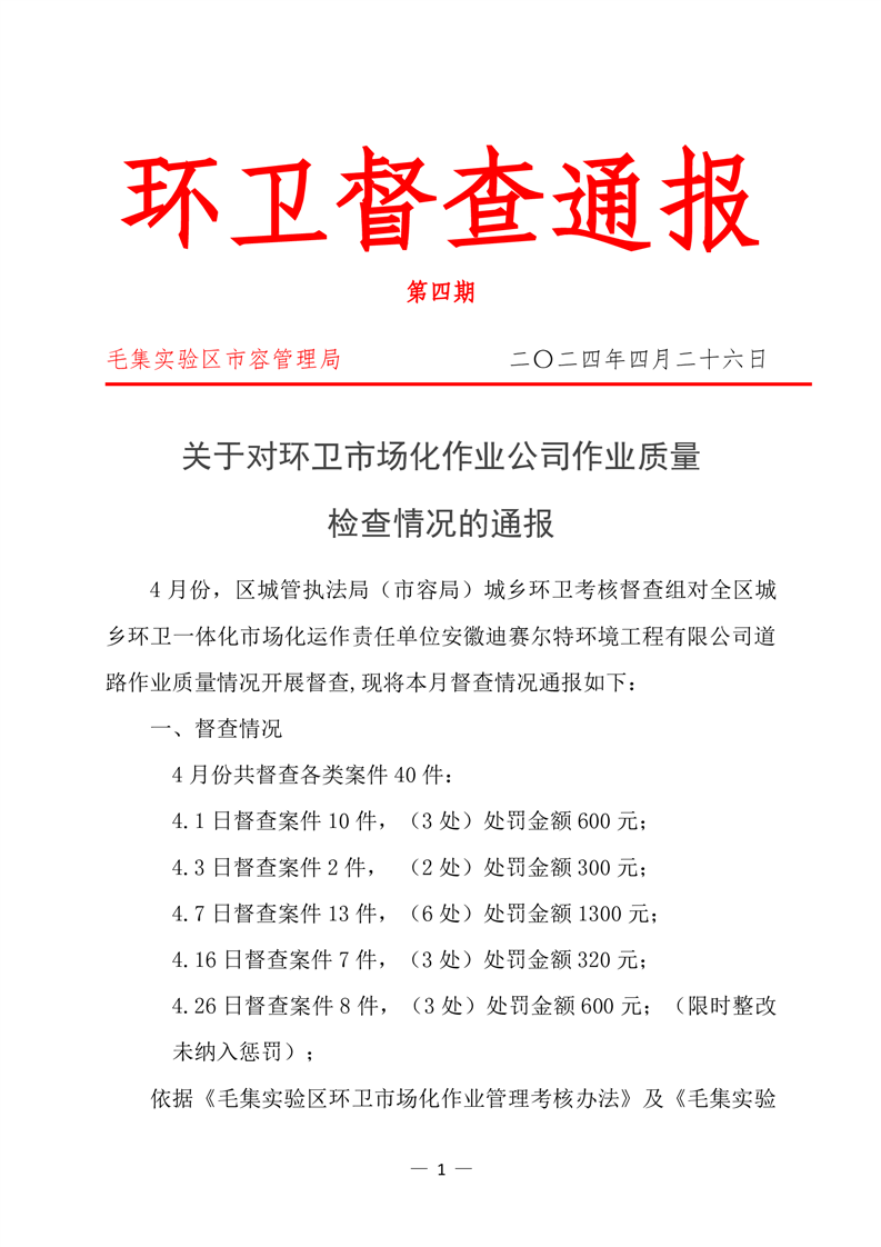 关于对环卫市场化作业公司作业质量检查情况的通报