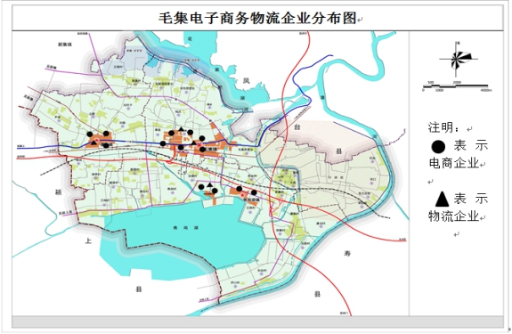 毛集实验区农村电商物流配送中心(邮乐购)已经完成所有43个行政村布点工作。截至目前,累计建成快递物流配送中心县乡村三级建设数量45个,乡镇、村电子商务服务站点43个,行政村覆盖率达到100%,培训电商管理人305人次、从业人员65人次。邮政部门建设的邮乐购农村电子商务运营中心已全面建成并投入运营,安徽乡妹子电子商务有限公司打造的供销社电商金融服务中心在全区范围内完成布点10余家,月销售额达500万元以上,由其投资建设的毛集实验区电子商务公共服务中心基本建成。安徽韵天医药物流集团总投资5000万元,建设自有的大型仓库及物流运输车队,在毛集实验区及周边开设门店62家。整个区域电商企业与物流企业分布大致如图所示。