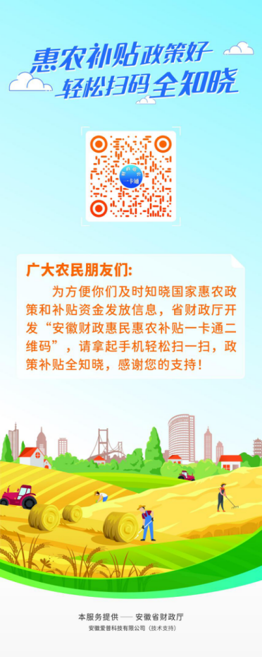 为进一步深化党史学习教育“我为群众办实事”实践活动,让农民群众多渠道知晓惠民惠农政策和补贴资金发放信息,省财政厅开发了“安徽财政惠民惠农补贴(一卡通)二维码”。您只需拿起手机,扫描下方二维码,就可以全面知晓惠农政策和自己补贴资金发放信息。