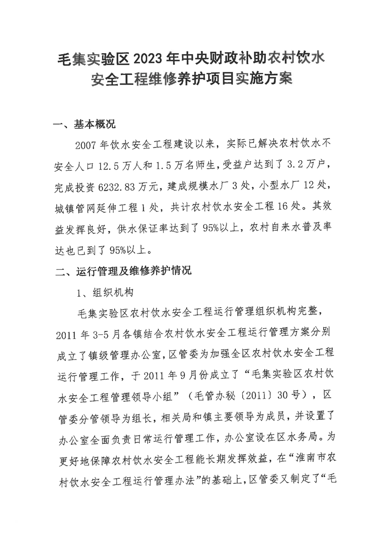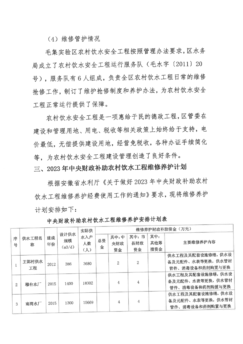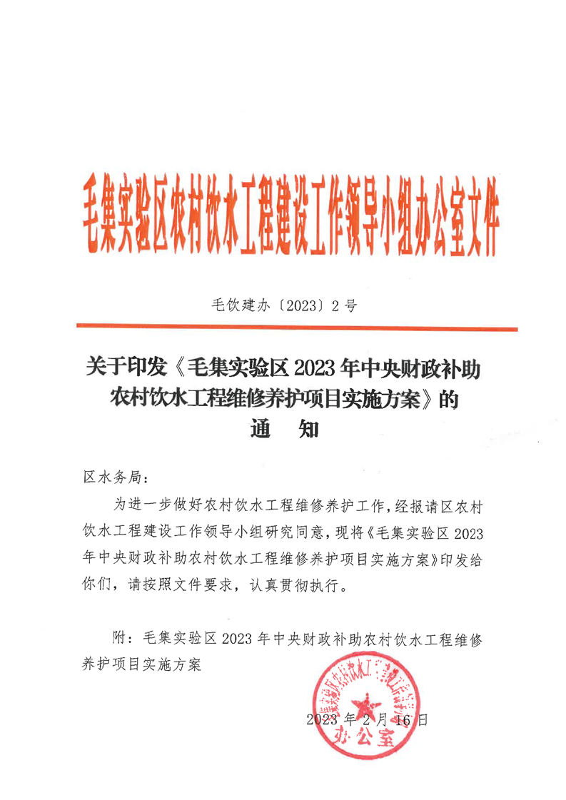关于印发《毛集实验区2023年中央财政补助农村饮水工程维修养护项目实施方案》的通知
