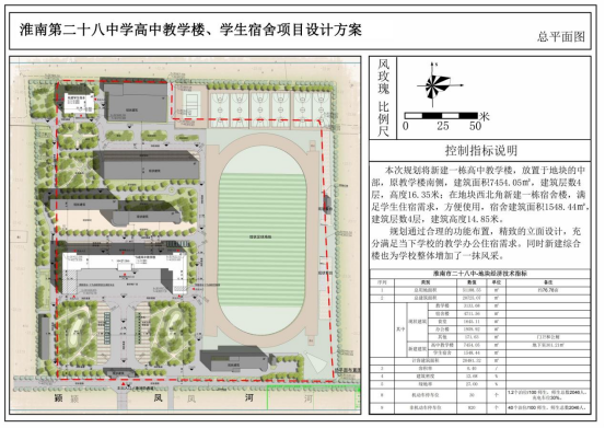 项目地块位于G345北部,淮南第二十八中学校区内,规划新建一栋高中教学楼,建筑面积7454.05㎡,建筑层数4层,在地块西北角新建一栋学生宿舍,宿舍建筑面积1548.44㎡,建筑层数4层,容积率0.4,建筑密度12.68%,绿地率27%。