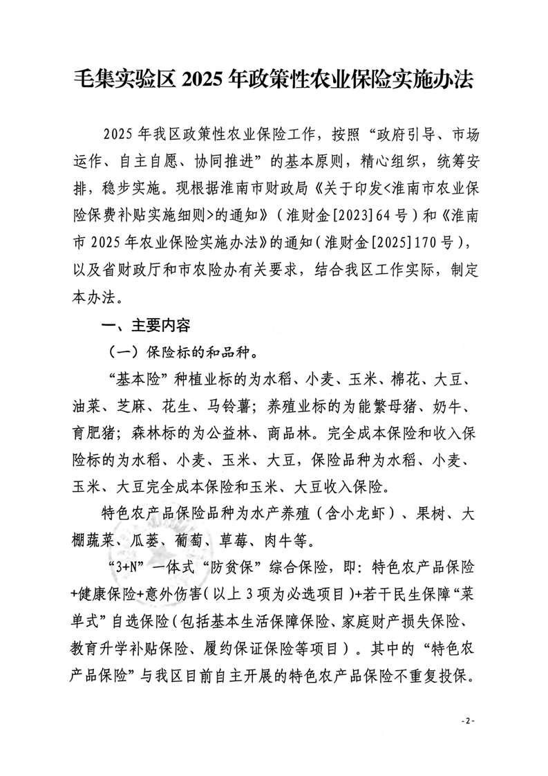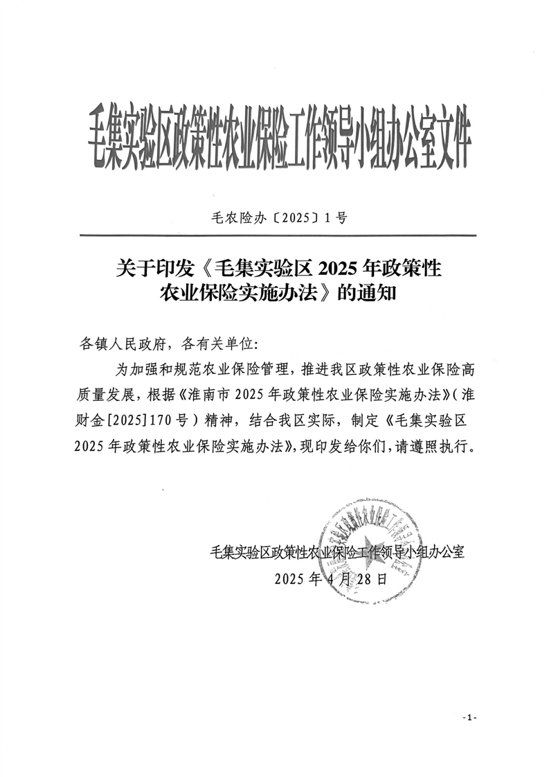 关于印发《2025年毛集实验区政策性农业保险实施办法》的通知
