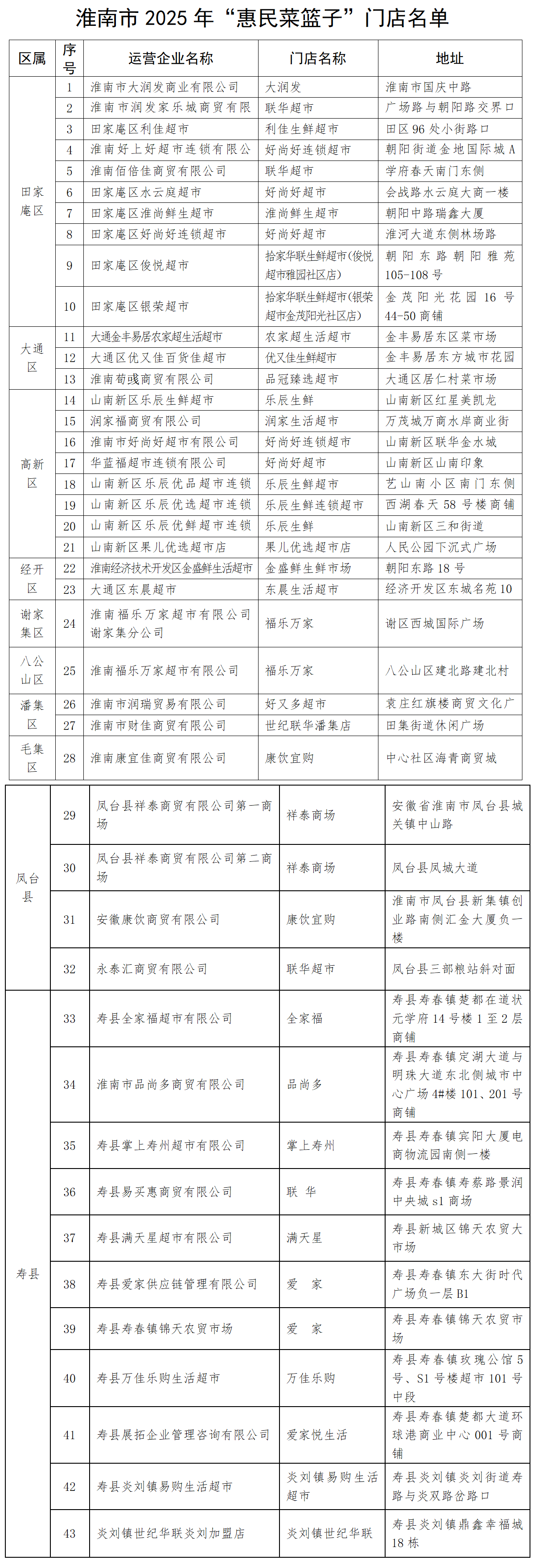 为贯彻落实《淮南市民生工作领导小组办公室关于印发2025年30项民生实事落实方案的通知》(淮民生办〔2025〕2号)要求,保障节假日消费高峰期重要民生商品市场供应,充分发挥“惠民菜篮子”门店稳价惠民的作用,决定启动2025年中秋、国庆节期间“惠民菜篮子”运行,现就有关事项通告如下: