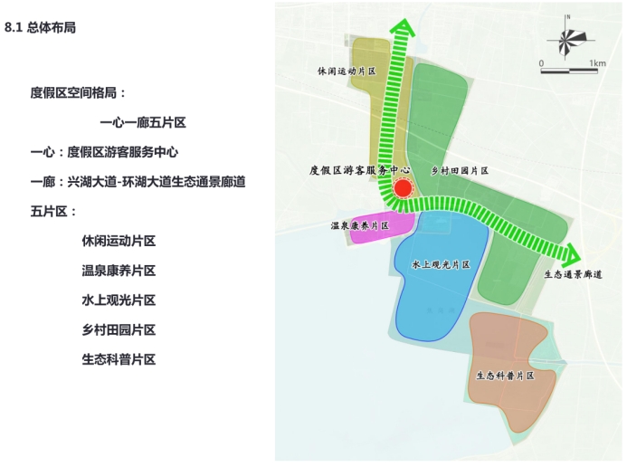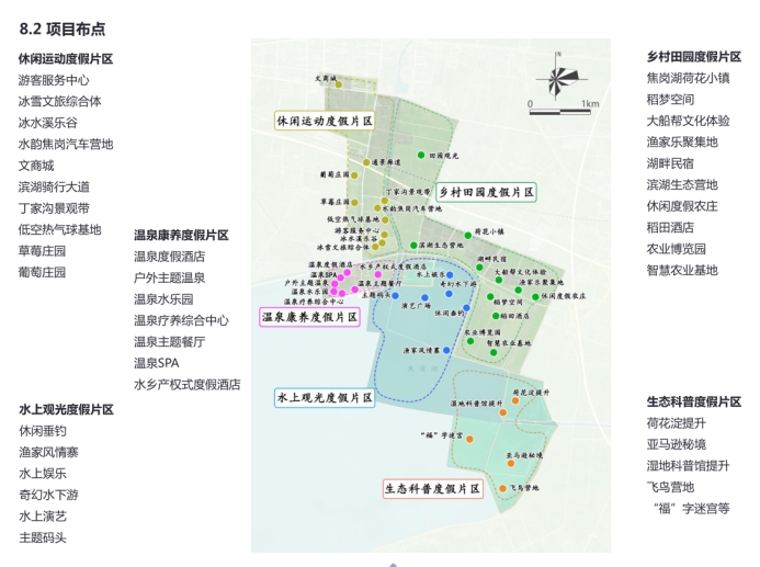 休闲运动片区、温泉康养片区、水上观光片区、乡村田园片区、生态科普片区