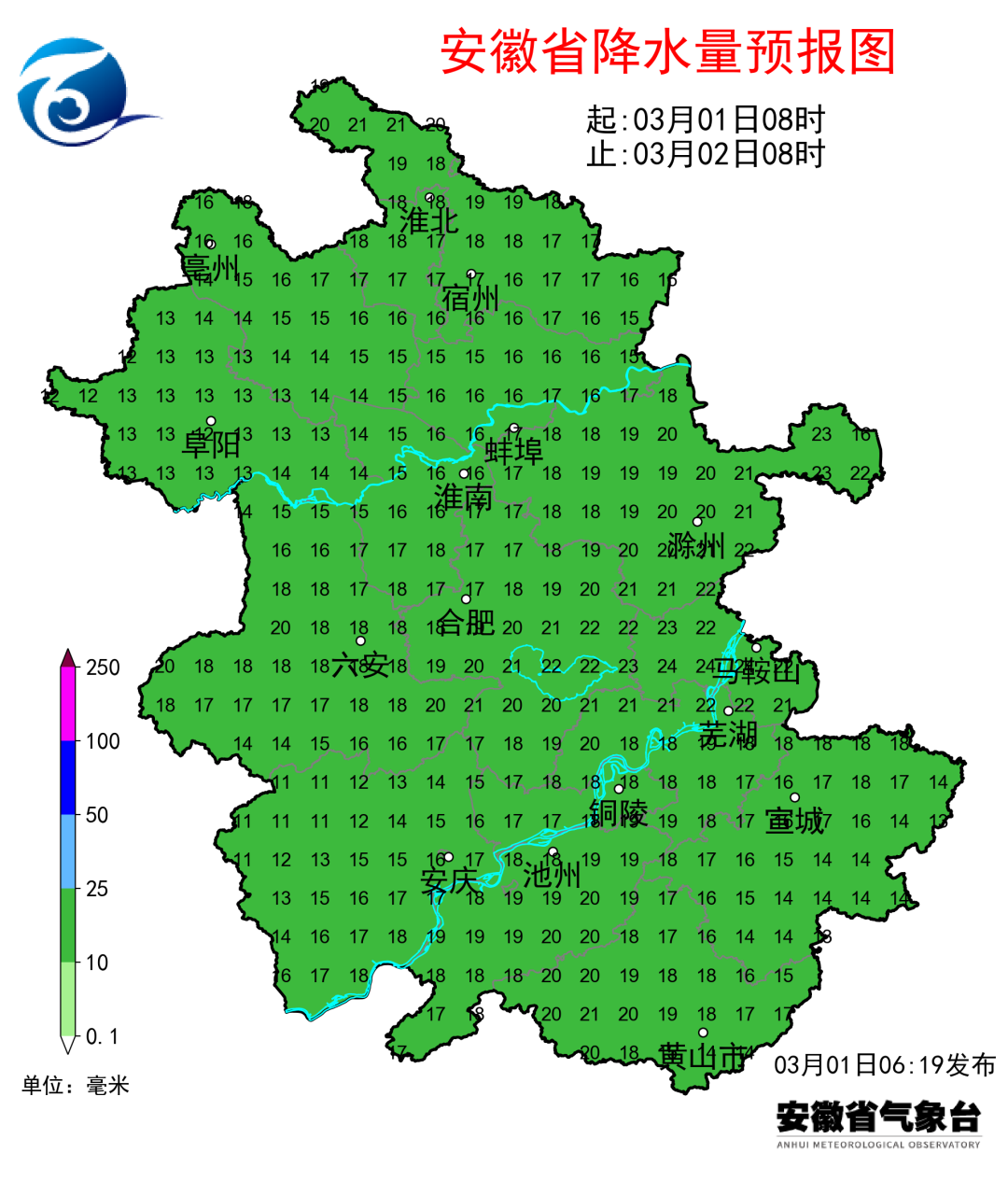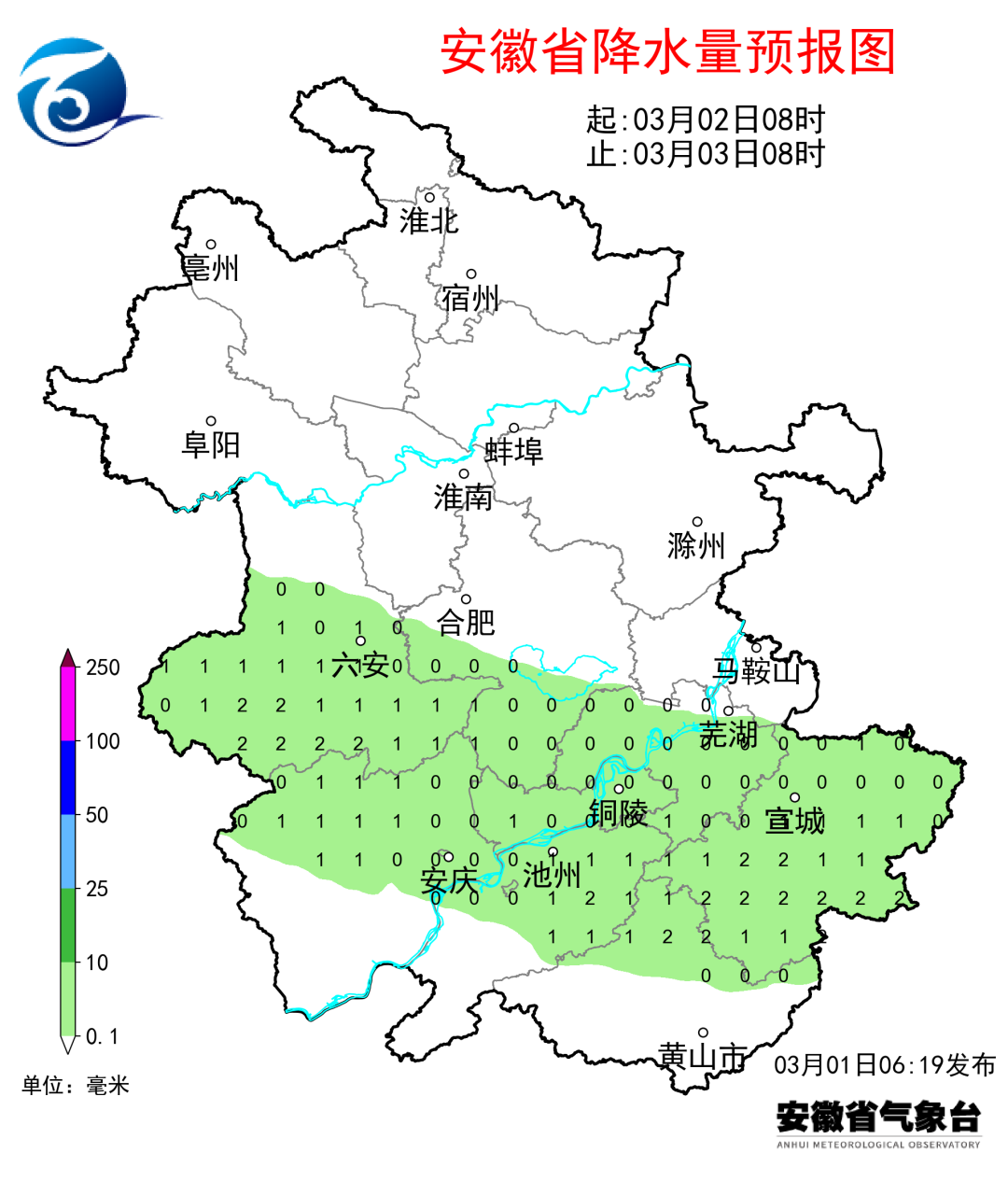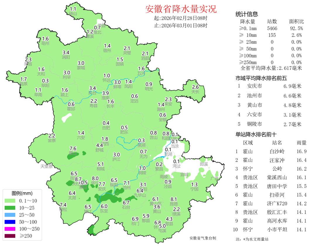 昨天全省大部分地区出现小雨,其中大别山区南部和沿江西部有155个站中雨,最大霍山白沙岭16.9毫米。
