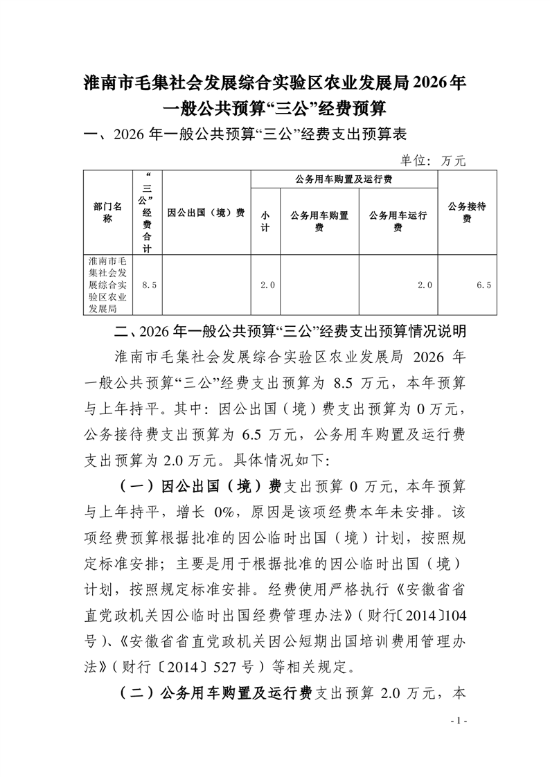淮南市毛集社会发展综合实验区农业发展局2026年一般公共预算“三公”经费预算