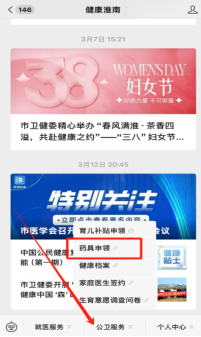 2.点击健康淮南首页“公卫服务”-“药具申领”。