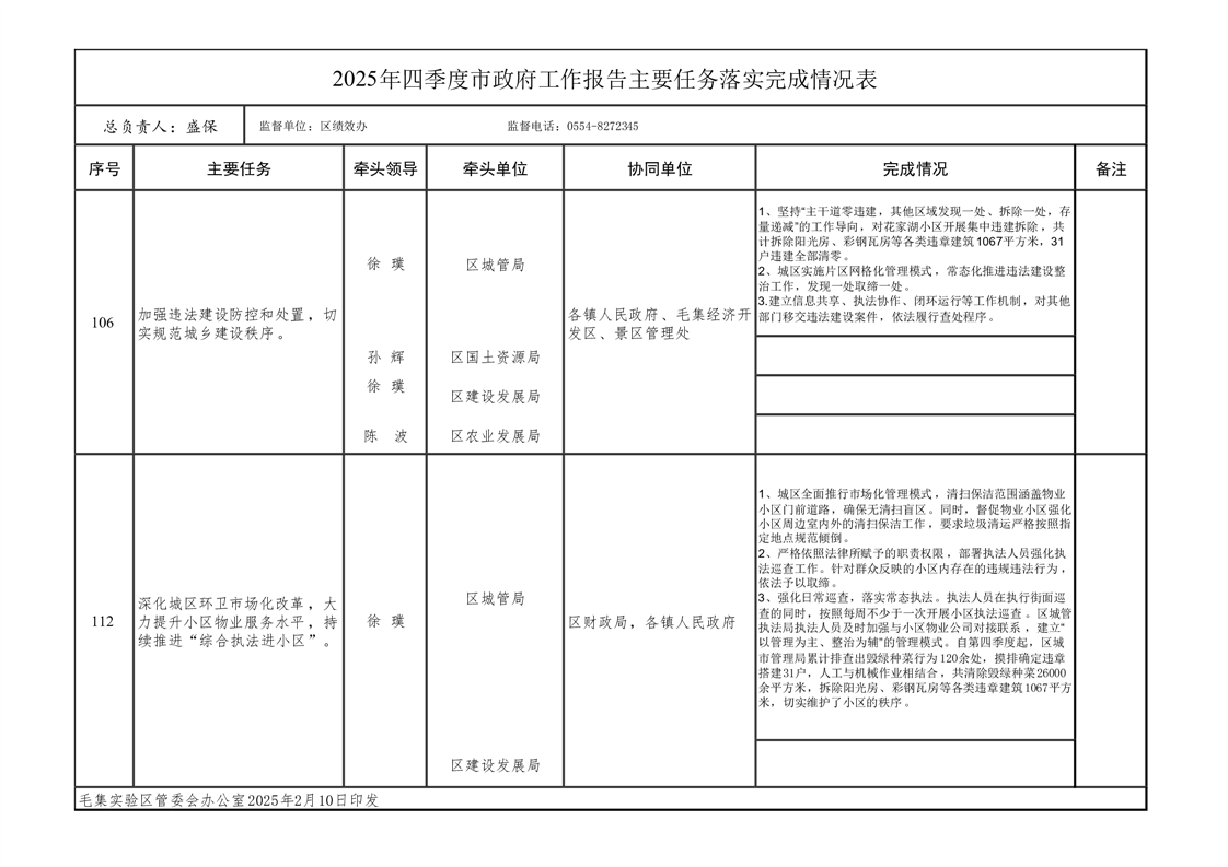 毛集实验区城管执法局2025年四季度市政府工作报告任务完成情况表