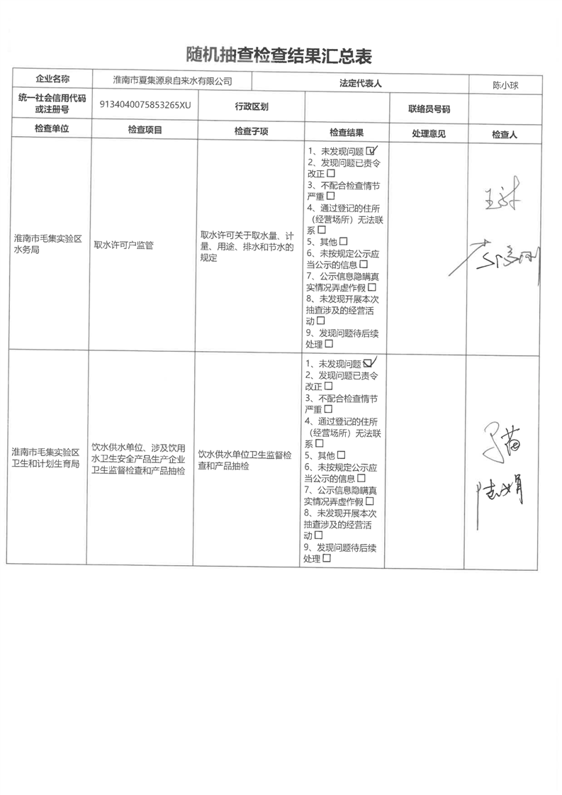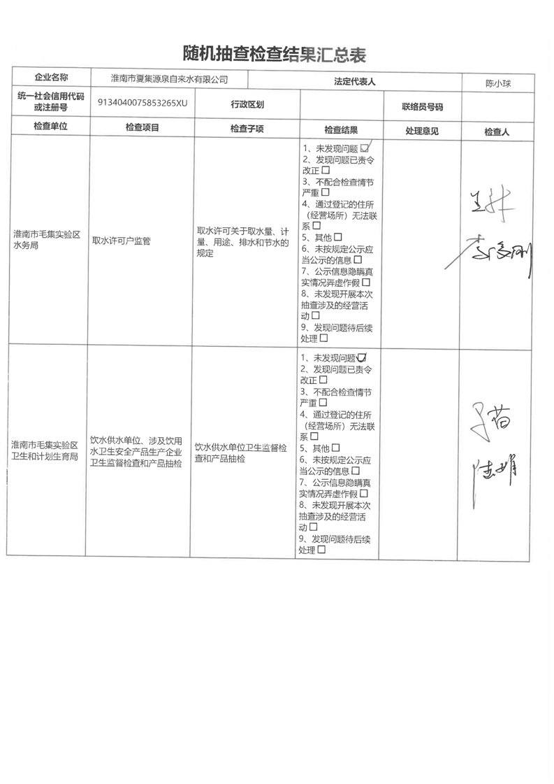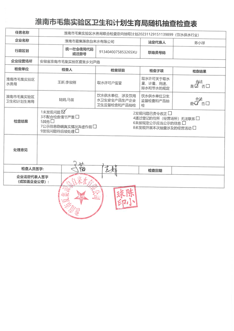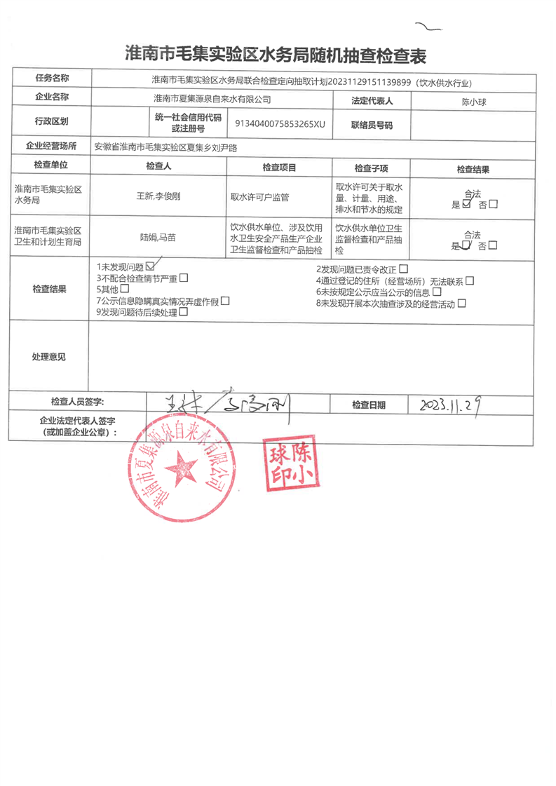 毛集实验区水务局2023年度“双随机、一公开”工作暨“一业一查”部门联合抽查结果