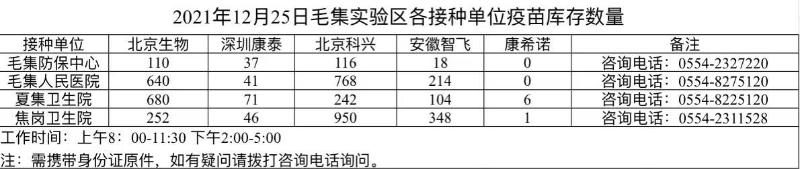 2021年12月25日毛集区各接种点新冠疫苗供应数量